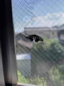 幼虫から虫かごで育てていたアゲハ蝶が孵化して舞っています。